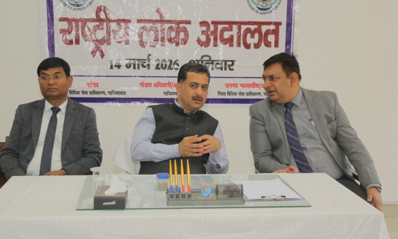 गाजियाबाद,(आनन्द धारा),14 मार्च 2026। राज्य विधिक सेवा प्राधिकरण लखनऊ के निर्देशानुसार जिला विधिक सेवा प्राधिकरण गाजियाबाद के तत्वावधान में शनिवार को जिला न्यायालय परिसर में राष्ट्रीय लोक अदालत का आयोजन किया गया। कार्यक्रम की अध्यक्षता जनपद न्यायाधीश/अध्यक्ष जिला विधिक सेवा प्राधिकरण विनोद सिंह रावत ने की। इस दौरान मोटर दुर्घटना दावा अधिकरण के पीठासीन अधिकारी संजयवीर सिंह, प्रधान न्यायाधीश परिवार न्यायालय मृदुल मिश्रा, एडीजे-01 अनिल कुमार चतुर्थ, विशेष न्यायाधीश पॉक्सो एक्ट नीरज गौतम, नोडल अधिकारी राष्ट्रीय लोक अदालत गौरव शर्मा तथा सचिव जिला विधिक सेवा प्राधिकरण संजय सिंह द्वितीय सहित अन्य न्यायिक अधिकारियों ने भाग लिया।
